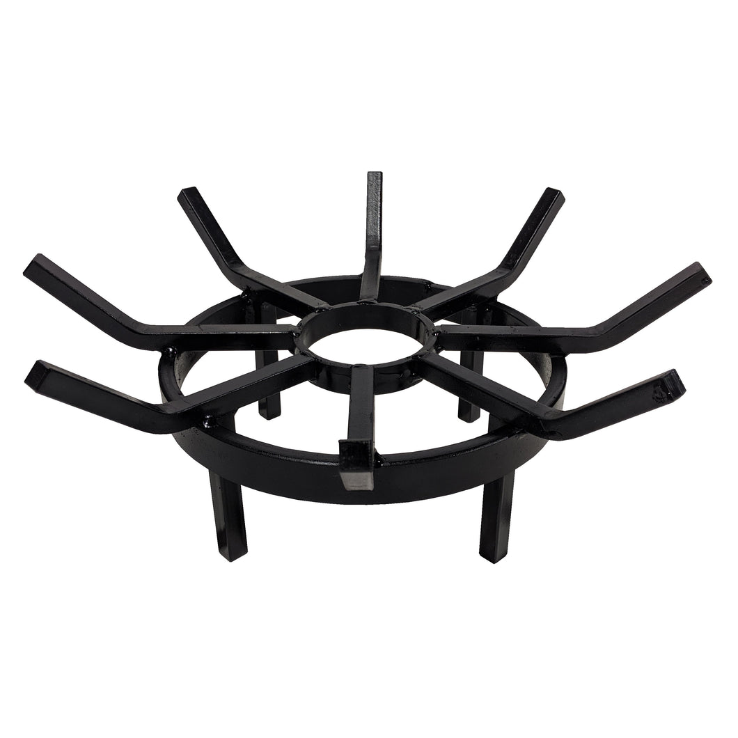 The Wagon Wheel Grate series is built from 1/2 inch thick square-bar steel for durability. Their innovative wheel-and-spoke shape lifts firewood off the ground to improve airflow to the fire while the flared tips help contain logs safely on top of the grate.